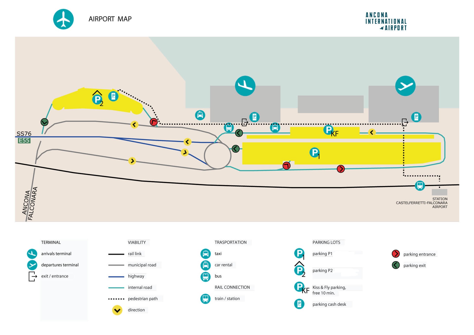 In front of the Departures Terminal at Ancona Airport, there is the Premium P1 car park (290 bays); a few metres from the Arrivals Terminal, there is the Multi-storey P2 car park (250 bays). Those accompanying travellers can use the “Kiss & Fly” area in front of the airport, which is free of charge for a maximum of 10 minutes.